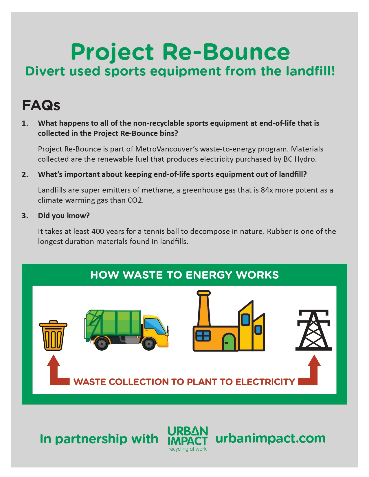 Project Re-Bounce now includes over 15 sports facilities and retail outlets in the Lower Mainland, Victoria, the Sunshine Coast, Squamish, and the British Columbia interior. With the support of Urban Impact and Metro Vancouver’s Solid Waste team, items across the Province are directed to the Waste-to-Energy facility.